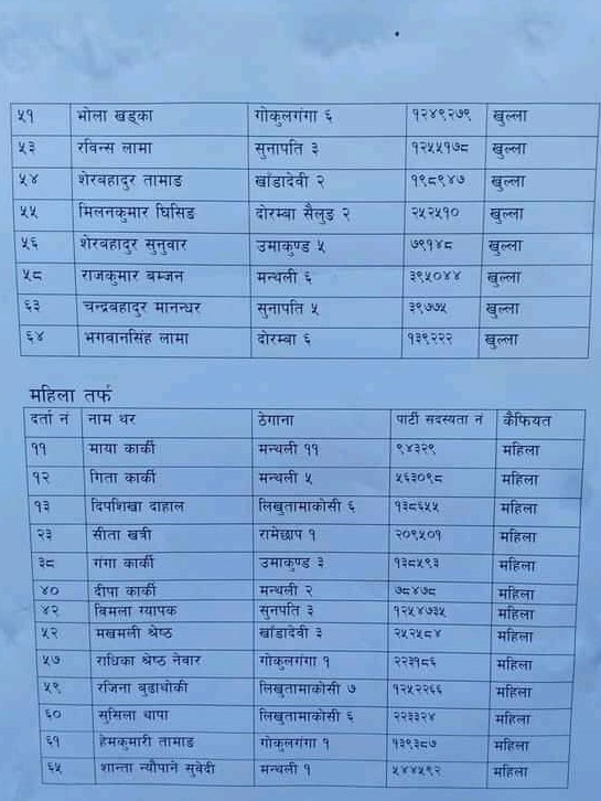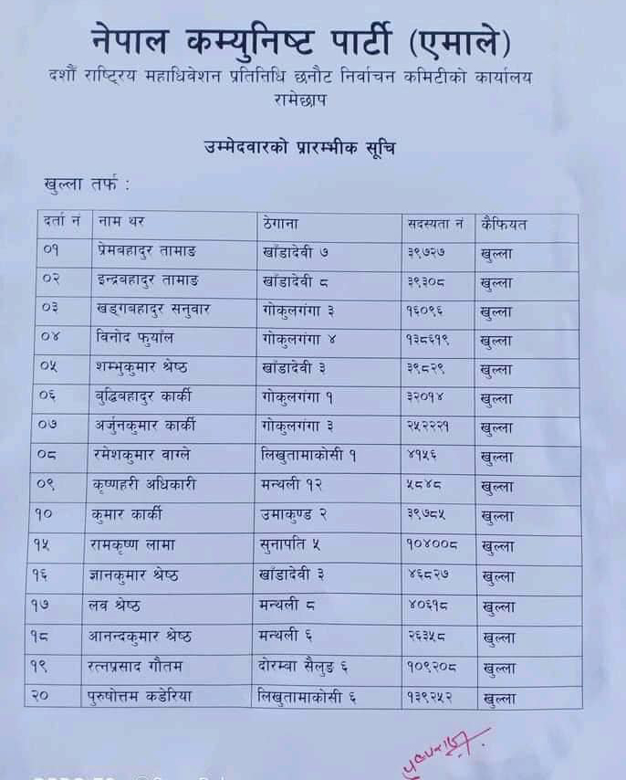 एमाले रामेछापमा १९ जना महाधिवेशन प्रतिनिधिका लागि ६५ जनाको उम्मेदवारी (नामावलीसहित)