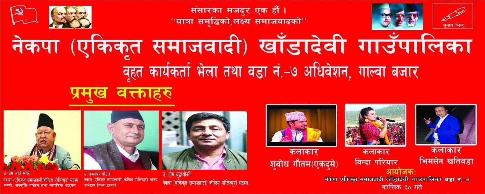 नेताहरुले सम्बोधन गर्ने कार्यक्रम तय भएको छ । मन्त्री आलेबाट भोली नेकपा एकीकृत खाँडादेवी गाउँकमिटी–७ को वडा अधिवेशनको समेत उदघाटन गर्ने कार्यक्रम रहेको छ ।