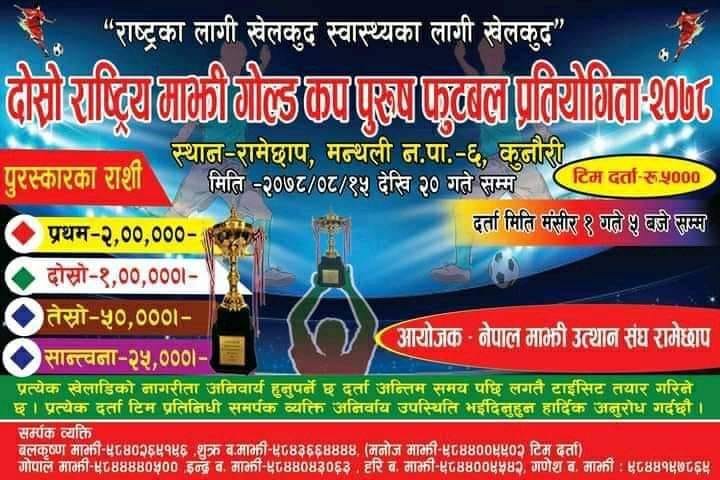 रामेछाप जिल्लामा आयोजित दोस्रो माझी गोल्ड कप फुटबल प्रतियोगिताको उपाधी आयोजक टिम नेपाल माझी उथान संघ रामेछापले नै जितेको छ ।