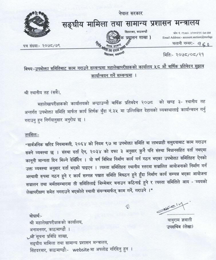स्थानीय तहमा उपभोक्ता समितिको नामबाट अनियमितता र भ्रष्टचार मौलाउदै गएको निष्कर्ष सहित सरकारले स्थानीय तहमा गठन भएका उपभोक्ता समितिबाट काम नगराउन देशभरका स्थानीय तहलाई निर्देशन दिएको छ । महालेखा परीक्षकको कार्यालय र अख्तियार दुरुपयोग अनुसन्धान आयोगको प्रतिवेदनमा अनियमितताको मुख्य जड उपभोक्ता समिति रहेको देखिएपछि सरकारले उपभोक्ता समितिबाट हुने काममाथि बन्देज लगाउन निर्देशन दिएको हो ।