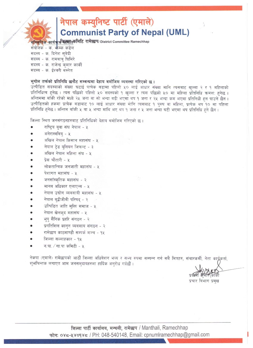 एमाले रामेछापकाे जिल्ला अधिवेशनमा ६८२ जना प्रतिनिधि सहभागी हुने,नेताहरुकाे जिम्वारी ताेकियाे