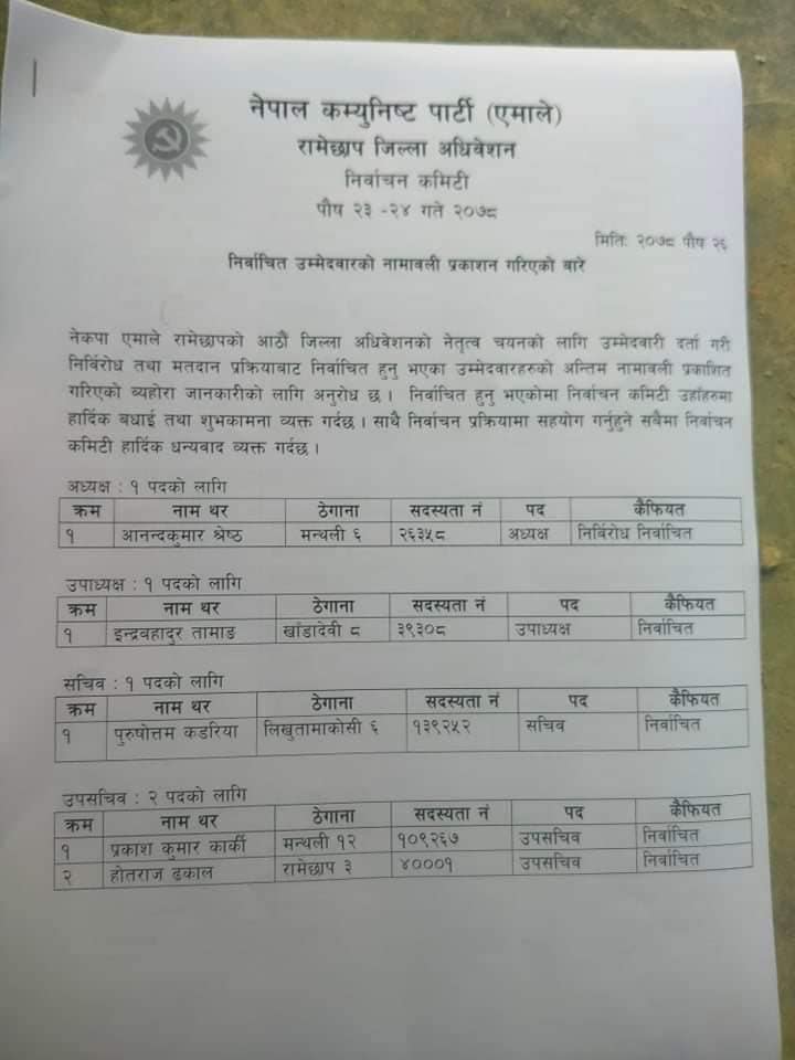 नकेपा एमाले रामेछापमा नयाँ नेतृत्वको लागि भएको चुनावबाट पदाधिकारी र जिल्ला कमिटीको सदस्यहरु निर्वाचित भएका छन् । अध्यक्षमा आनन्द श्रेष्ठ सर्वसम्मत रुपमा निर्वाचित हुँदा बाँकी रहेको पदाधिकारी र सदस्यको लागि चुनाव भएको थियो ।