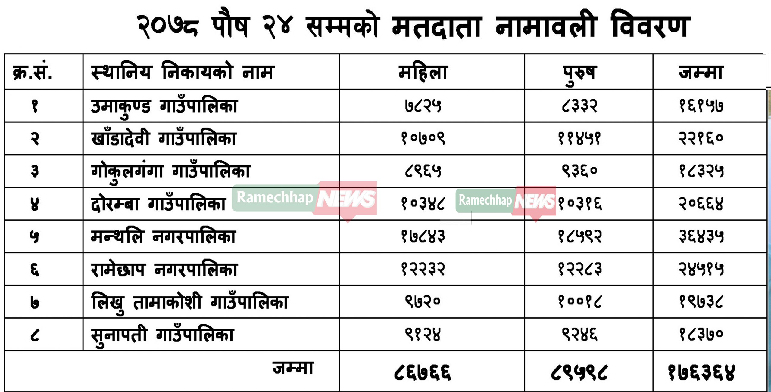 रामेछाप जिल्लामा जनसंख्या भन्दा मतदाताको संख्या बढी देखिएपछि गम्भीर प्रश्न खडा भएको छ । जनगणनाको क्रममा सत्यतथ्य तथ्याङ्ग संकलन भएकोमा आशंका उब्जिएको छ । केन्द्रीय तथ्याङ्ग विभागले सार्वजनिक गरेको प्रारम्भिव जनगणनामा रामेछापमा दस बर्षको अवधिमा ३२ हजार जनसंख्या घटेको छ । २ लाख २६ जनसंख्या रहेको रामेछापको जनसंख्या घटेर अहिले १ लाख ७० हजारमा झरेको छ । जनसंख्यासँग बाझिने गरी मतदाताको संख्या भने बढी देखिएको छ ।