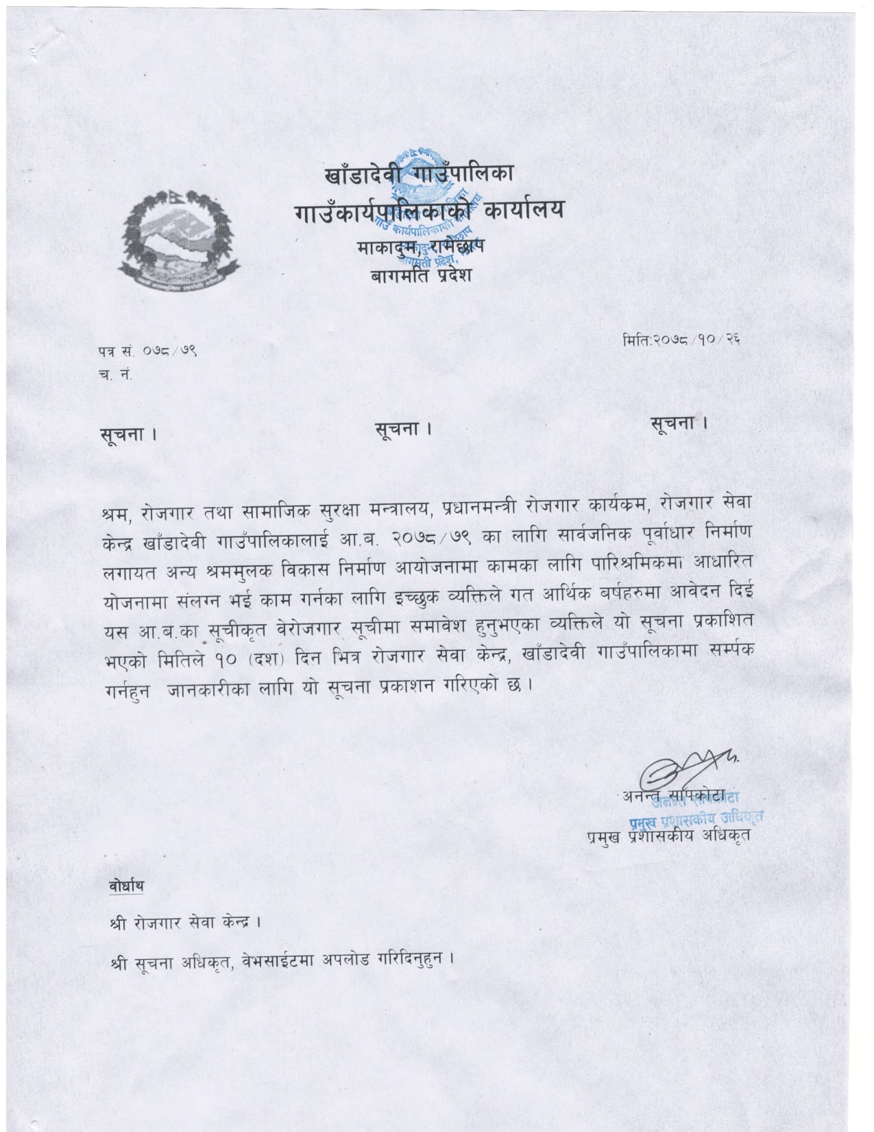 गाउँपालिकाले यस आर्थिक बर्षका लागि सार्वजनिक पूर्वाधार निर्माण लगायत अन्य श्रममूलक विकास निर्माण आयोजनाको कामका लागि पारिश्रमिकमा आधारित योजना संलग्न भई काम गर्नका लागि इच्छुक व्यक्तिले गत आर्थिक बर्षमा आवेदन दिएका थिए । उक्त आवेदन अनुसार यस आर्थिक बर्षका लागि सूचीकृत बेरोजगारको सूचीमा समावेश भएकाहरुलाई आगामी दस दिनभित्रमा सम्पर्कमा आउन गाउँपालिका सूचना जारी गरेको छ ।