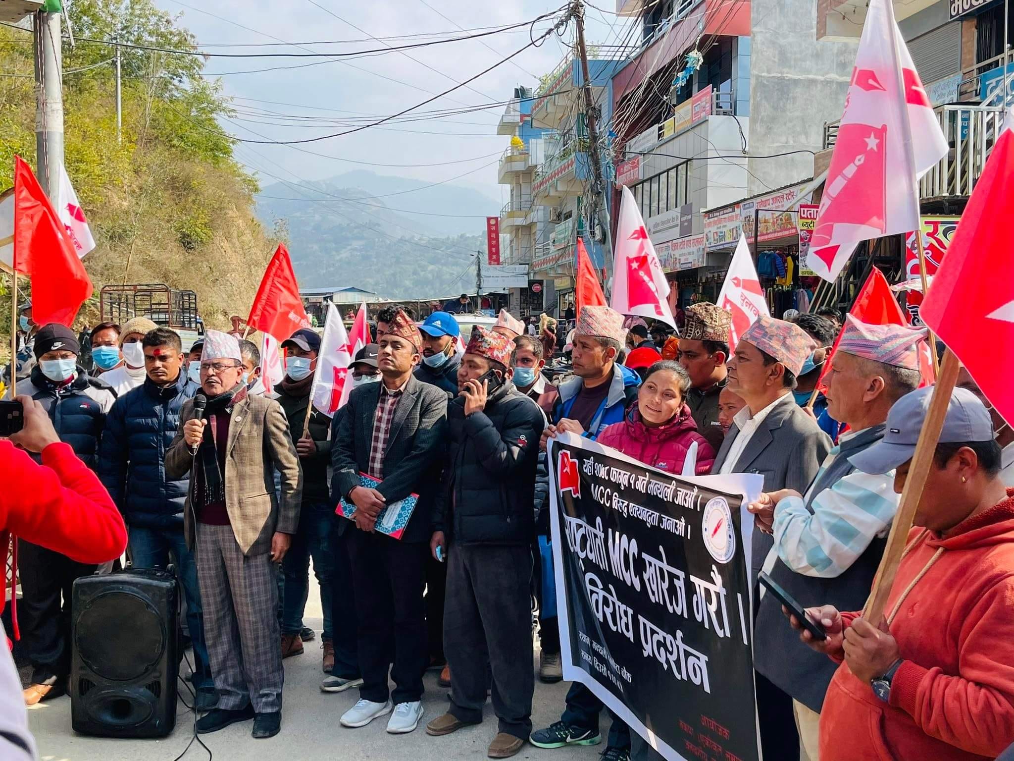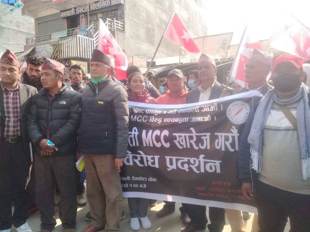 सत्तारुढ दल नेकपा एकीकृत समाजवादीले अमेरिकी सहयोग मिलिनियम च्यालेन्ज कर्पोरेसन (एमसीसी) खारेजीको माग गदै रामेछापमा विरोध प्रदर्शन गरेको छ । सरकारले एमसीसी पास गर्ने नीति अनुरुप संसदमा टेबल गर्ने योजना अगाडि बढाएपछि सत्तारुढ दल एकीकृत समाजवादी आन्दोलित बनेको हो । प्रधानमन्त्री शेरबहादुर देउवाले एमसीसी अगाडि बढाउने गृहकार्य अगाडि बढाएपछि नेकपा (एस)ले देशव्यापी रुपमा आन्दोलनको घोषणा गरेको छ । घोषित कार्यक्रम अनुसार नेकपा (एस)ले आइतवार सदरमुकाम मन्थलीमा एमसीसी खारेजीको माग गर्दै विरोध प्रदर्शन गरेको हो ।