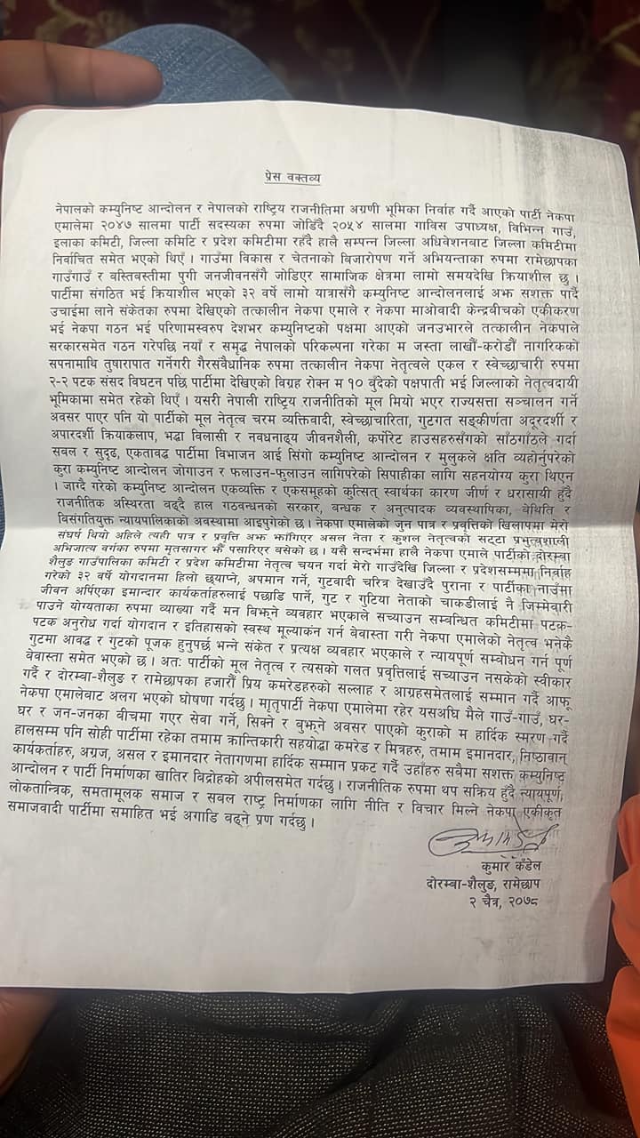साविकको टोकरपुर गाविसमा एमालेको तर्फबाट गाविस उपाध्यक्षसमेत निर्वाचित भएका कँडेलले आफू २०४७ सालमा कम्युनिष्ट पार्टीको सदस्य बनेको र त्यही समयदेखि एमालेमा सकृय रहेको बताउँदै दोरम्बा शैलुङ गाउँपालिका तथा जिल्ला कमिटी चयनका सिलसिलामा संगठनमा आफ्नो भूमिकाको मूल्यांकन नगरिएकाले पार्टी त्याग्नु परेको बताएका छन् ।