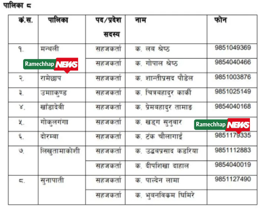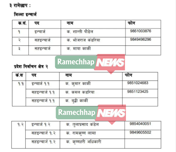 रामेछाप प्रदेश ‘क’ को इन्चार्जमा कुमार कार्की, सह इन्चार्जद्धयमा कमल कडरिया र बुद्धी कार्की, प्रदेश ‘ख’ को इन्चार्जमा तुलाप्रसाद कँडेल र सह इन्चार्जद्धयमा रामकृष्ण लामा र कृष्णहरि अधिकारीलाई जिम्मेवारी दिएको छ । आगामी स्थानीय तहको निर्वाचनमा आठ वटा स्थानीय तहको समन्वय गर्ने गरी सहकर्ताको व्यवस्था गर्दैै जिम्मेवारी पनि बाँडफाँड गरेको छ ।