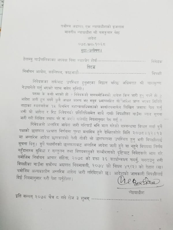 निवेदनमा जनप्रतिनिधिले चुनावअगावै राजीनामा दिँदा स्थानीय तह रिक्त हुने भएकाले सो प्रावधान हटाउन अन्तरिम आदेश माग गरिएको छ। रिटमा निर्वाचन आयोगलाई विपक्षी बनाइएको छ। न्यायाधीश बमकुमार श्रेष्ठको एकल इजलासले निवेदकले अन्तरिम आदेश जारी गरि पाउँ भनि माग गरेको सम्बन्धमा विचार गर्दा दुबै पक्षको छलफलपश्चात निर्णयमा पुग्दा मनासिब हुने देखिएकाले मिति चैत १३ मा अन्तरिम आदेश छलफलको पेसी तोकी सो छलफलमा उपस्थित हुनु भनी विपक्षीलाई सूचना दिन आदेश दिएका छन् ।
