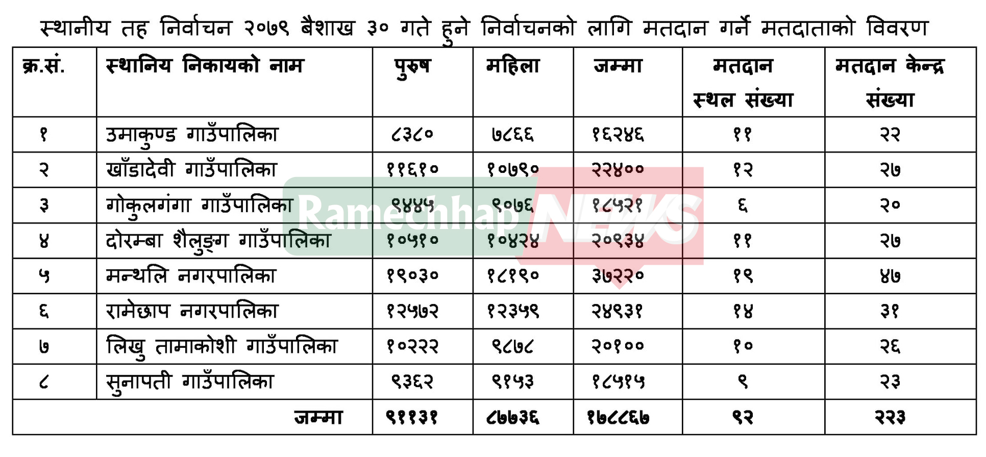 रामेछापमा ९२ मतदान स्थल,२२३ मतदान केन्द्र कायम, कुन स्थानीय तहमा कति ?