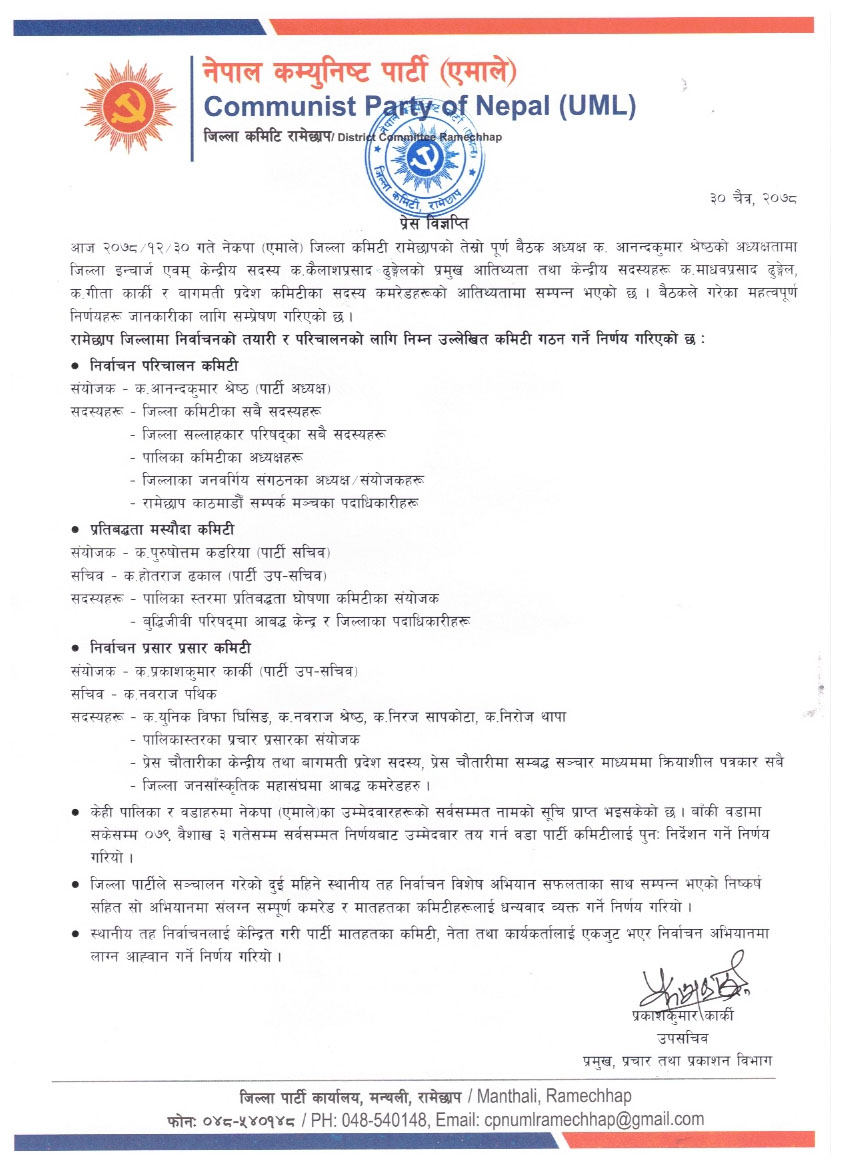 रामेछापमा स्थानीय तहको निर्वाचन जित्ने यस्ताे छ एमालेकाे निर्णय, (पूर्णपाठसहित)