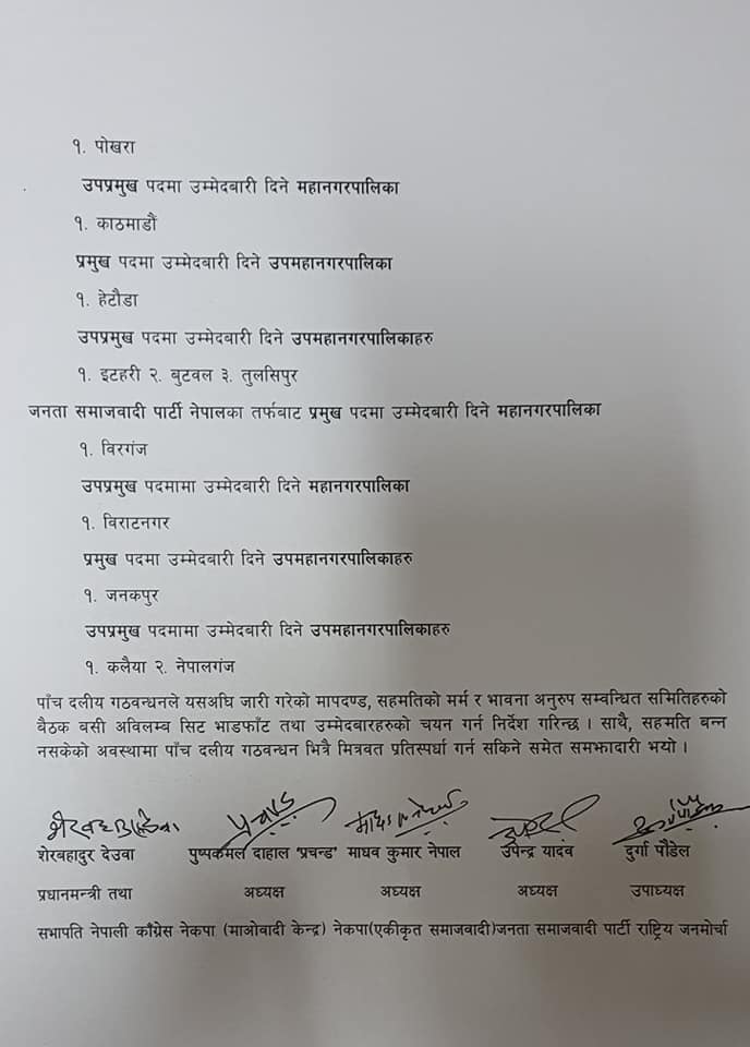 बुधबार प्रधानमन्त्रीको सरकारी निवास बालुवाटारमा बसेको नेपाली कांग्रेस, नेकपा माओवादी केन्द्र, नेकपा एकीकृत समाजवादी, जनता समाजवादी पार्टी र राष्ट्रिय जनमोर्चाबीच महानगर र उपमहानगरको नगर प्रमुख र नगर उपप्रमुखमा लिखित सहमति नै भएको छ । सहमति अुनसार कांग्रेसले विराटनगर, काठमाडौं र ललितपुरको नगरप्रमुख तथा वीरगञ्ज, भरतपुर र पोखरा महानगरपालिकाको नगर उपप्रमुख पद लिनेछ ।