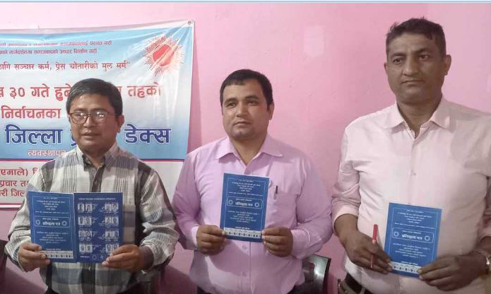 नेकपा एमाले रामेछापले स्थानीय तह निर्वाचनमा आफ्ना पार्टीका उम्मेदवारलाई के कामका लागि जिताउने भन्ने आधार र योजना सहितको प्रतिवद्धता पत्र सार्वजनिक गरेको छ । एमालेले आज रामेछापको मन्थलीमा एक कार्यक्रमकोबीच १९ वटा विषयमा स्थानीय तहका तात्कालिक र दीर्घकालीन कार्यक्रम समेटिएको प्रतिवद्धतापत्र सार्वजनिक गरेको हो । एमाले रामेछापका अध्यक्ष आनन्द श्रेष्ठ, उपसचिव प्रकाश कुमार कार्की सहितका नेताहरुले जिल्लाको आठ वटै स्थानीय तहमा गरिने कामको विषय समावेश गरिएको प्रतिबद्धता पत्र सर्वाजनिक गरेको हुन् ।