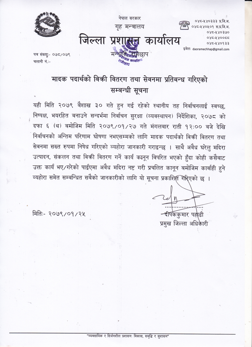 स्थानीय तह निर्वाचन यही बैशाख ३० गते हुँदैछ। निर्वाचनलाई लक्षित गरेर प्रशासनले मदिराको प्रयोगमा रोक लगाएको हो।