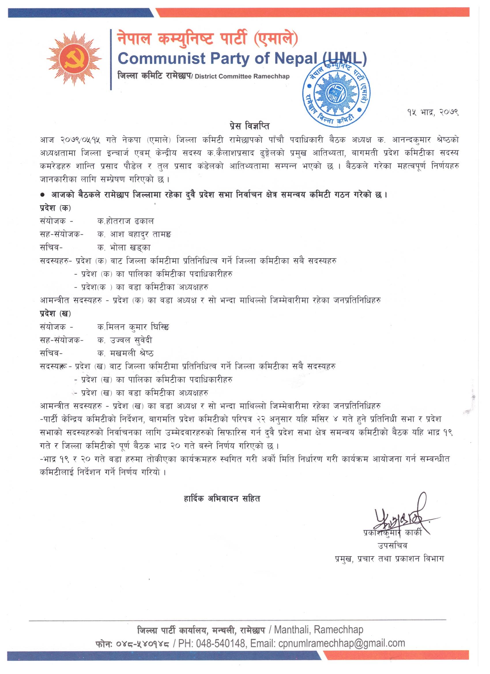 प्रदेशसभा ‘क’ अन्तर्गत समितिको सह–संयोजकमा आशबहादुर तामाङ र सचिवमा भोला खड्का रहेका छन भने प्रदेश ‘ख’ अन्तर्गत सह–संयोजकमा उज्वल सुवेदी र सचिवमा मखमली श्रेष्ठलाई जिम्मेवारी दिने निर्णय पार्टी प्रचार विभाग प्रमुख प्रकाश कुमार कार्कीले बताए । उनका अनुसार पार्टीबाट यही भदौ १९ गते बस्ने बैठकले प्रदेश सभा सदस्य प्रत्यक्षतर्फका उम्मेदवारहरुको सिफारिस गर्नेछ ।