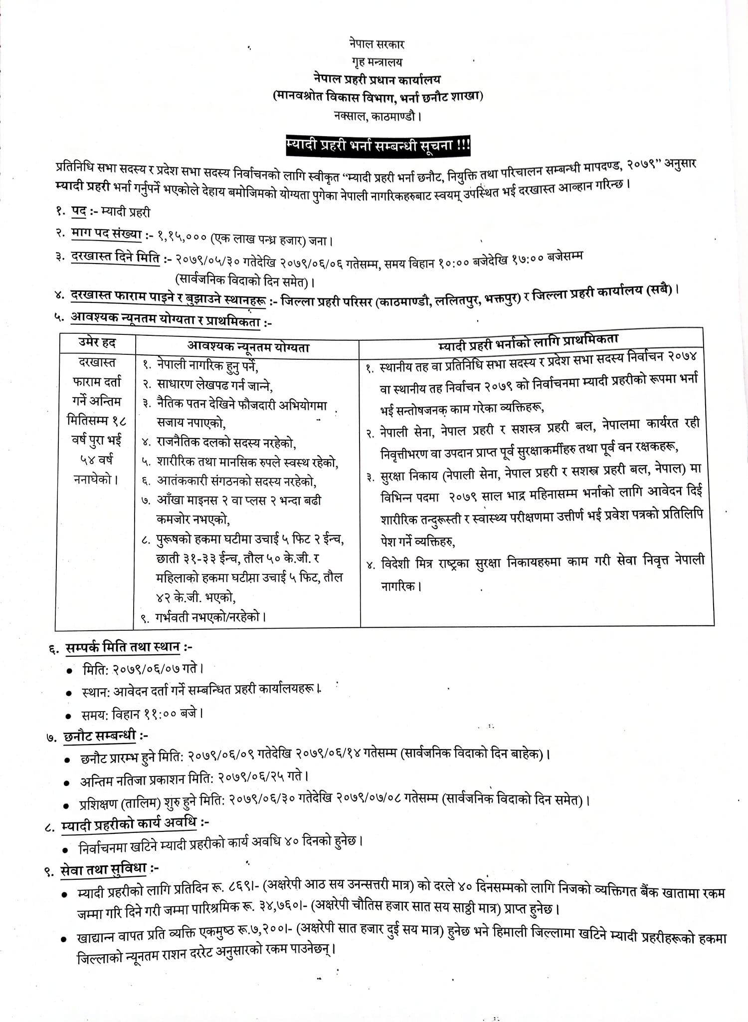 जिल्ला प्रहरी कार्यालय रामेछापका प्रवक्ता राजु प्रसाद ढकालले भदौ ३० गतेबाट असोज ६ गतेसम्म म्यादी प्रहरीमा भर्ना हुनको लागि आवेदन दिन सक्ने समय रहेको बताए । उनले भने,‘म्यादी प्रहरीमा भर्ना हुनको लागि आवेदन दिने क्रम बढदो रहेको छ ।’