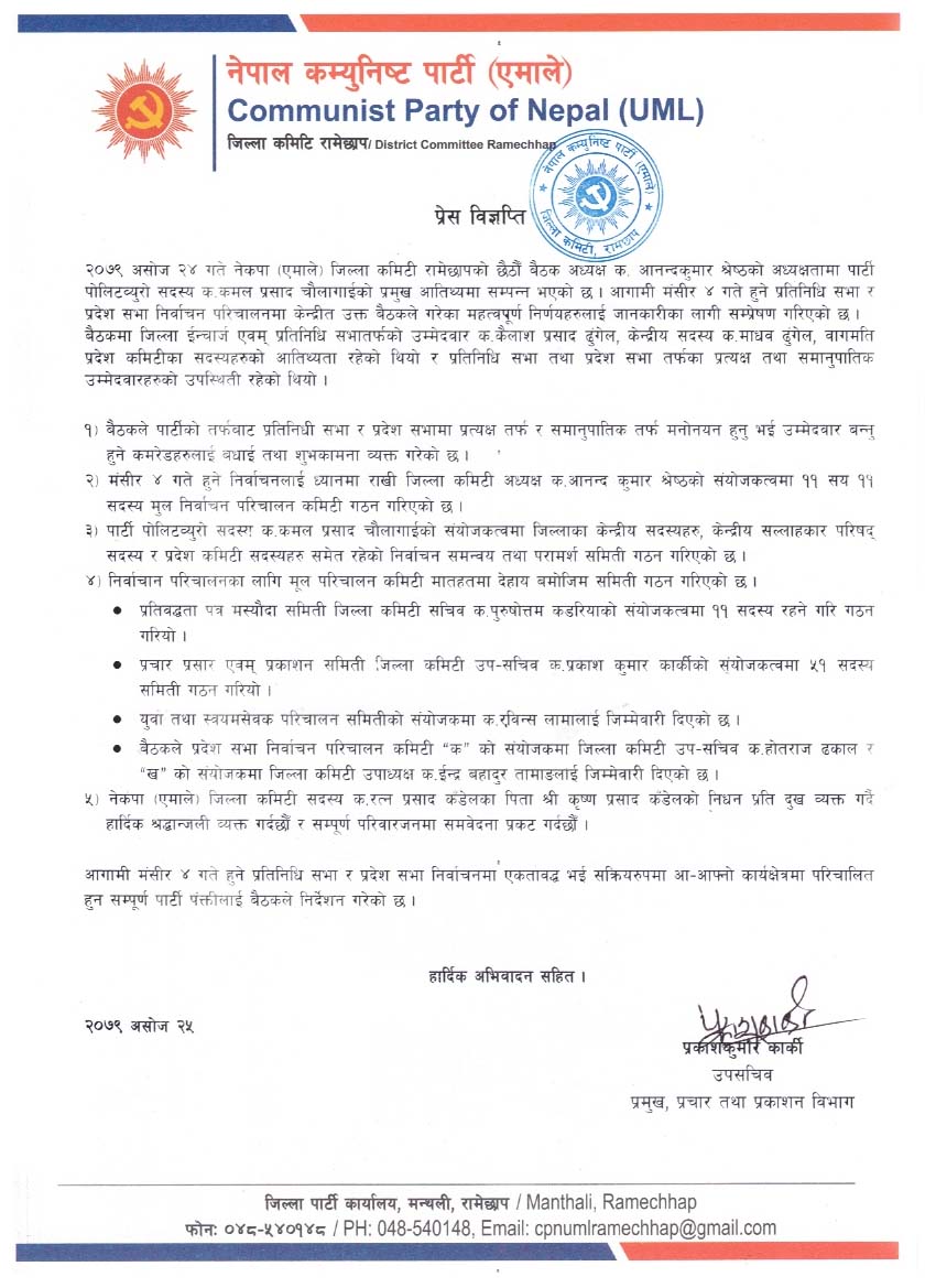 त्यसैगरी प्रचार प्रसार समितिको संयोजकमा उपसचिव प्रकाश कुमार कार्कीको संयाजकत्वमा ५१ सदस्यीय समिति गठन गर्दै प्रदेश क निर्वाचन परिचालन समितिका संयोजकमा उपसचिव होतराज ढकाल, प्रदेश ख को निर्वाचन परिचालन समितिको संयाजकमा पार्टीका उपाध्यक्ष इन्द्र बहादुर तामाङ, युवा परिचालन समितिका संयोजकमा रविन्द लामालाई जिम्मेवारी दिने निर्णय गरेको छ ।’