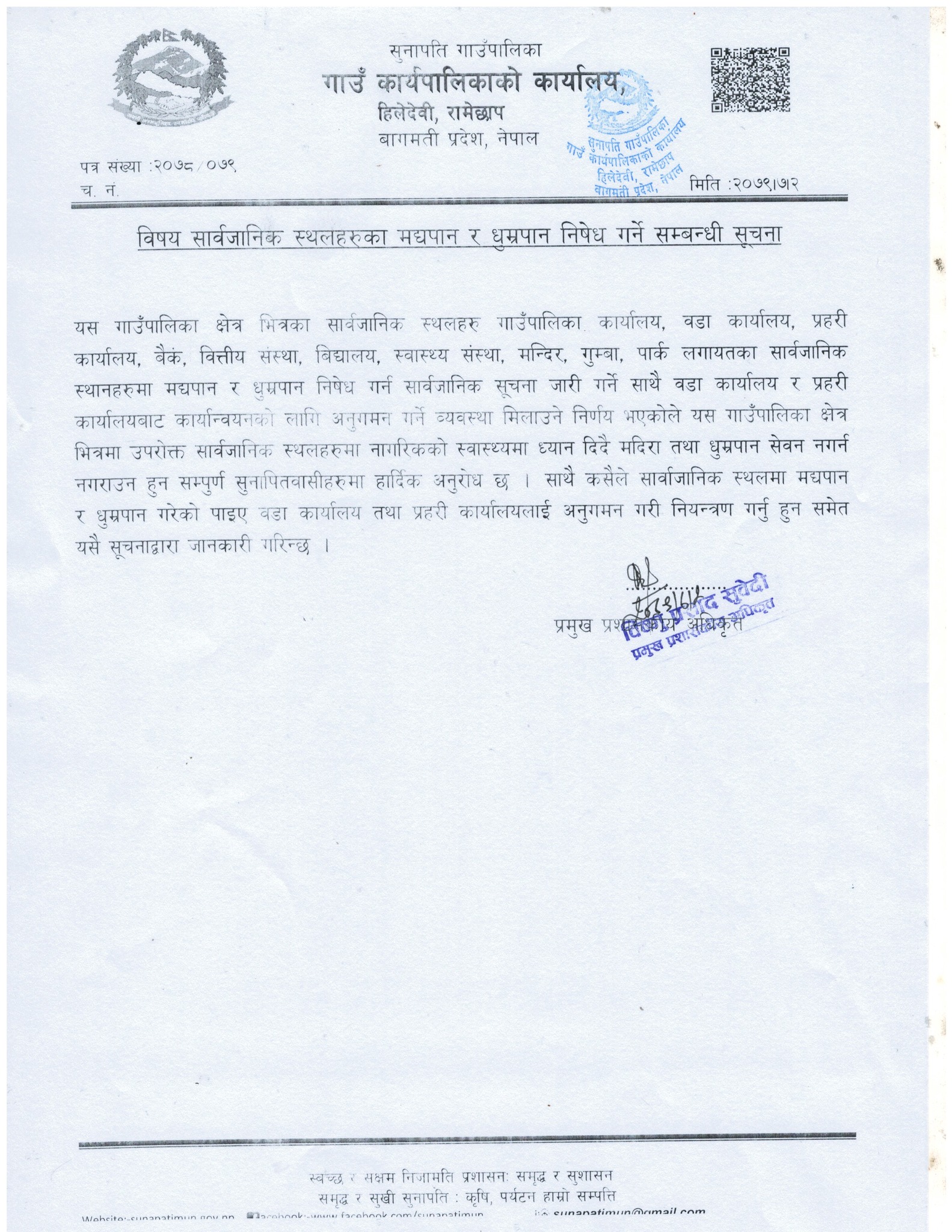 अब सुनापति गाउँपालिकाभित्र सार्वजनिक स्थलमा रक्सी र चुरोट खाए पक्राउ गरिने (सूचनासहित)