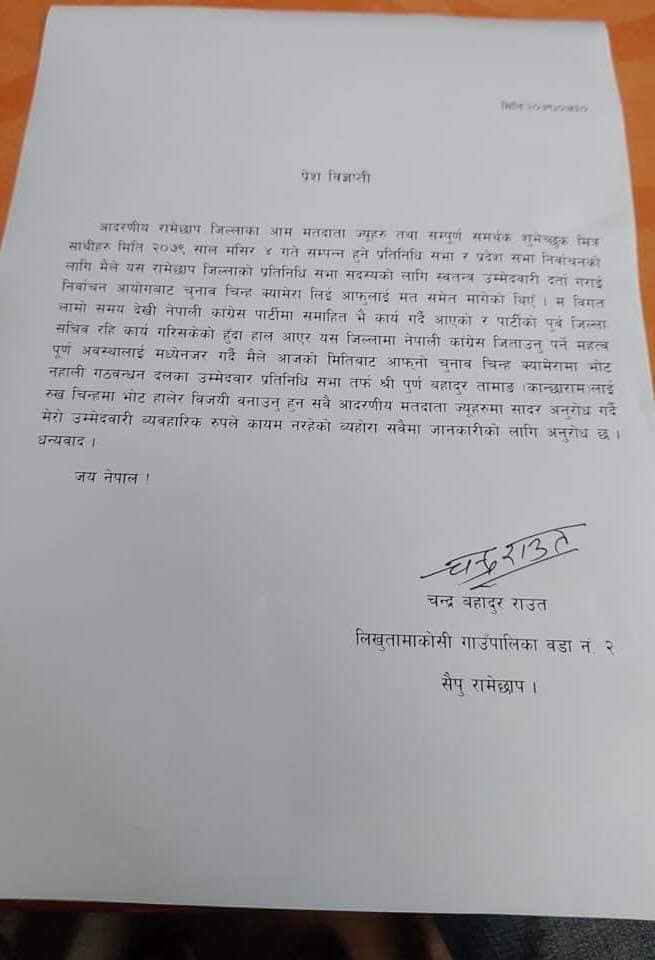 बुधवार एक कार्यक्रमकोबीच कांग्रेस रामेछापका पदाधिकारीसहितको उपस्थितिमा कान्छाराम र राउतले हात मिलाउदै राउतले पार्टीलाई धोका दिन नसक्ने भएर उम्मेवदारी निस्क्रिय बनाएको बताए । उनले विज्ञप्तीमा भनेका छन,नेपाली कांग्रेसमा आफ्नो रगत पसिना बगाएको र आफू पार्टीको जिम्मेवार व्यक्ति हुँ अन्तिम घडीमा पार्टीलाई धोका दिन सक्दिन, पार्टी प्रतिको विमति कायम रहे पनि हाललाई म म्मेदवारी नरहेको र पूर्णबहादुर कान्छारामलाई समर्थन गरेको छु । राउतले निर्वाचन आयोगले आफूलाई प्रदान गरेको क्यामेरा चिन्हमा मतदान नगरी पार्टीको उम्मेदवारलाई रुख चिन्हमा मतदान गर्न आग्रह गरेका छन् । कार्यक्रममा कान्छारामले राउतलाई पार्टीले उचित स्थान दिने र सम्मान गर्ने प्रतिबद्धता जनाएका छन् ।