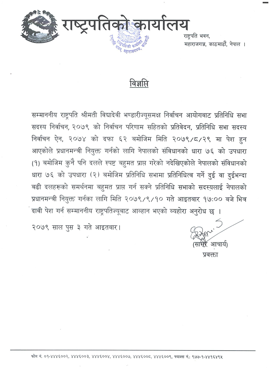 नयाँ सरकार गठन गर्न राष्ट्रपतिद्धारा ७ दिनको समय आह्वान