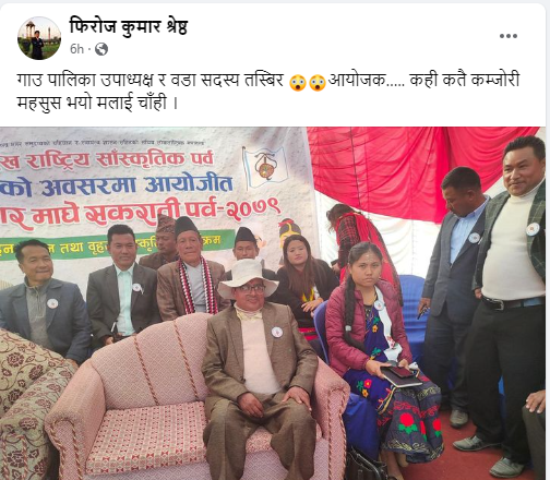 आयोजकले गाउँपालिकाको उपाध्यक्ष भन्दा वडा सदस्यलाई पहिलो रोहमा राखेको विषय यति बेला सामाजिक सञ्जालमा बहसको विषय बन्न पुगेको छ ।