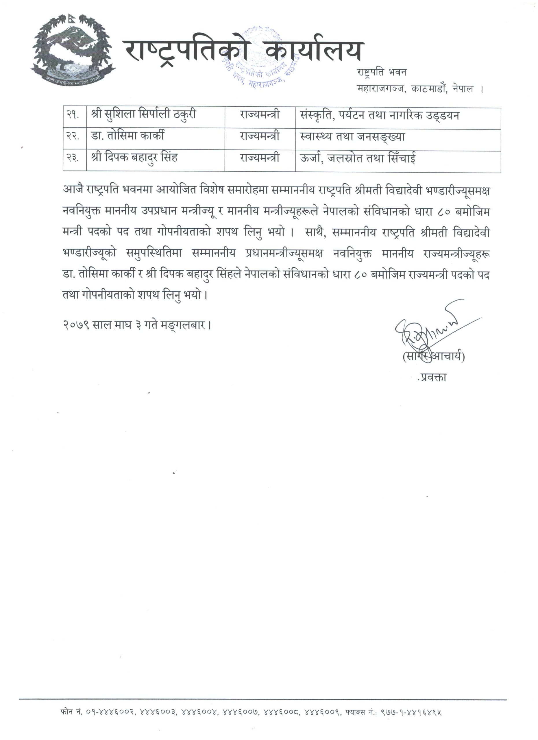काठमाडौँ । पुष्पकमल दाहाल प्रचण्ड नेतृत्वको मन्त्रिपरिषद् २३ सदस्यीय बनेको छ । राष्ट्रपति विद्यादेवी भण्डारीले मंगलबार १२ मन्त्री र ३ राज्यमन्त्री नियुक्त गरेसँगै प्रचण्ड नेतृत्वको सरकार २३ सदस्यीय बनेको हो । मन्त्रिपरिषद्मा उपप्रधानमन्त्री ४ जना रहेका छन् । नवनियुक्त मन्त्री तथा राज्यमन्त्रीको मंगलबार नै पद तथा गोपनीयताको शपथ भएर सिंहदरवारमा पद बहाली समेत गरिसकेका छन् ।