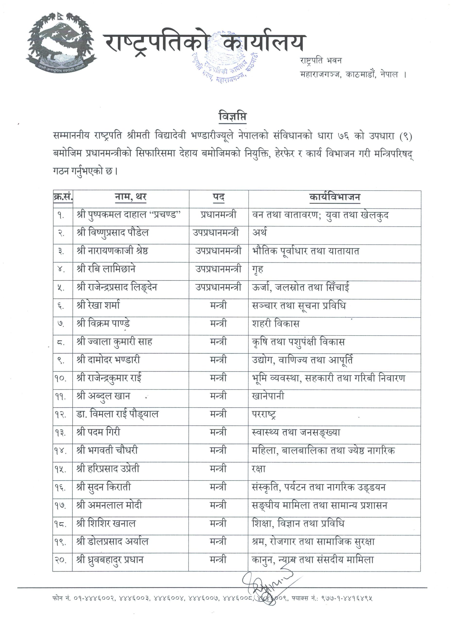 प्रचण्ड नेतृत्वको मन्त्रिपरिषद्, यस्तो छ कार्यविभाजन