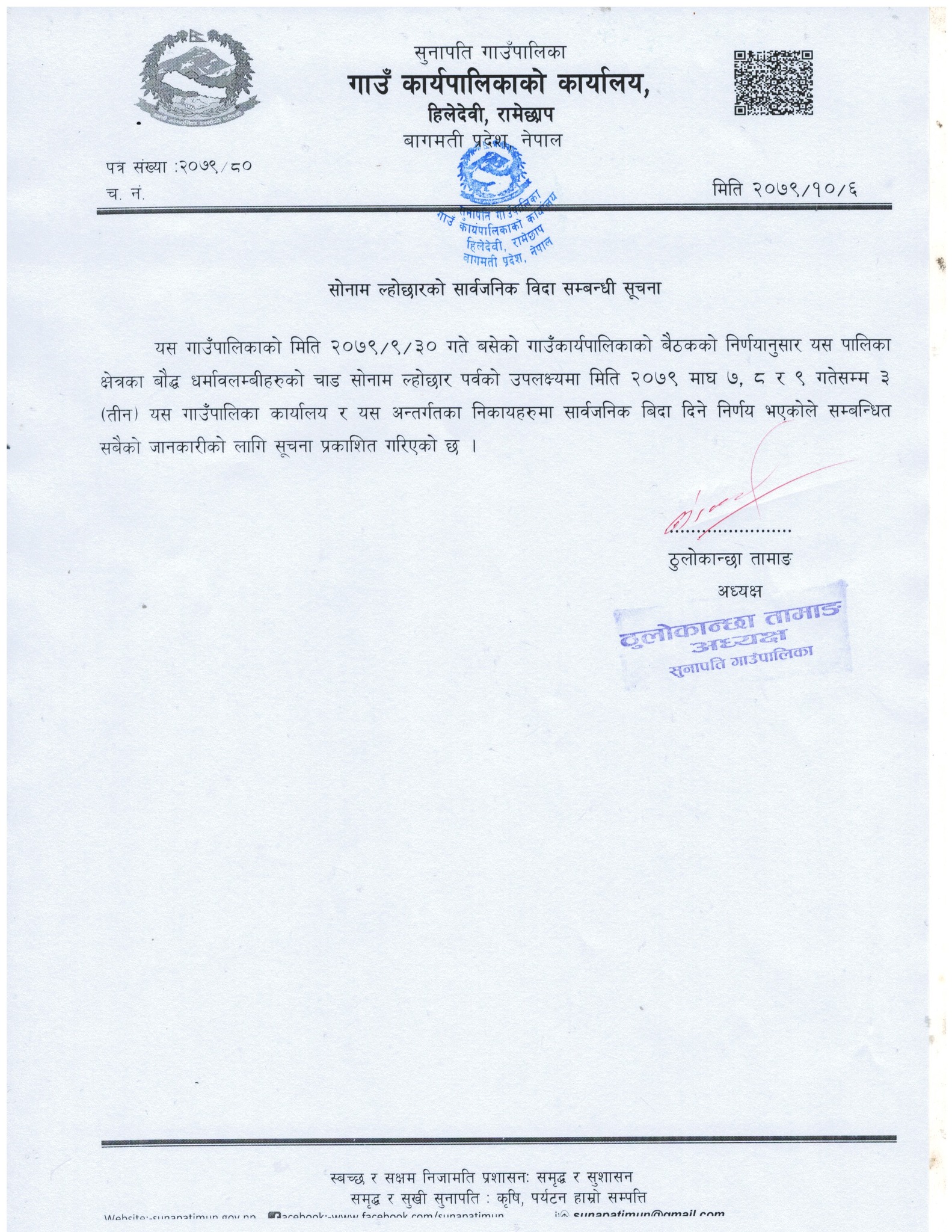 सुनापति गाउँपालिकाले सोनाम ल्होसारको अवसरमा दुई दिन सार्वजनिक बिदा दिने निर्णय गरेको छ । गाउँ कार्यपालिका बैठकले ल्होसारको अवसरमा दुई दिन विदा दिने निर्णय गरेको हो । सुनापति गाउँपाकिकाका अध्यक्ष ठूलोकान्छा तामाङले २८५९ औँ तावार ल्हो सोनाम ल्होसारको अवसरमा माघ ७ गते देखि ९ गतसम्म सार्वजनिक बिदा दिने निर्णय भएको बताए ।
