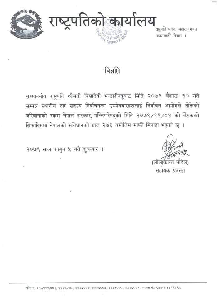 निर्वाचन आयोगले स्थानीय तहका उम्मेद्वारलाई तोकेको जरिवाना राष्ट्रपतिबाट मिनाहा