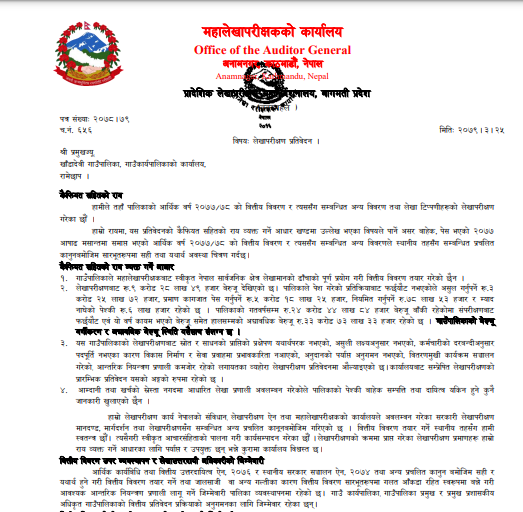 पालिकाले गतबर्षसम्म २४ करोड ४४ लाख ८४ हजार बेरुजू बाँकी रहेकामा संपरीक्षणबाट फछ्यौट एवं यो बर्ष कायम भएको बेरुजू समेत हालसम्म अद्यावधिक बेरुजू ३३ करोड ७३ लाख ३३ हजार रहेको महालेखापरीक्षकको कार्यालयले सार्वजनिक गरेको प्रतिवेदनमा उल्लेख गरेको छ ।