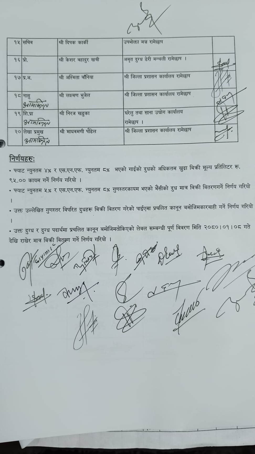 रामेछापमा उपभोक्ताको हितलाई ध्यान दिदै जिल्ला प्रशासन कार्यालय रामेछापले वैशाख १ गतेबाट लागू हुने गरी डेरी उद्योगले बढाएको दुधको मुल्य घटाउने निर्णय गरेको छ । रामेछापका सहायक प्रमुख जिल्ला अधिकारीको संयोजकत्वमा आज बसेको बैठकले यसअघि तोकिएको दुधको मुल्य घटाउने निर्णय गर्दै पहिलो पटक दुधको गुणस्तको समयत कामय गरेको हो । यसअघि गाईको दुधको मुल्य प्रतिलिटर ११० कायम गरिएमा आजको बैठकले प्रतिलिटर ९५ रुपैयाँ र भैसीको दुध प्रतिलिटर १२० कायम गरिएमा १०५ कायम गर्ने निर्णय गरेको छ ।