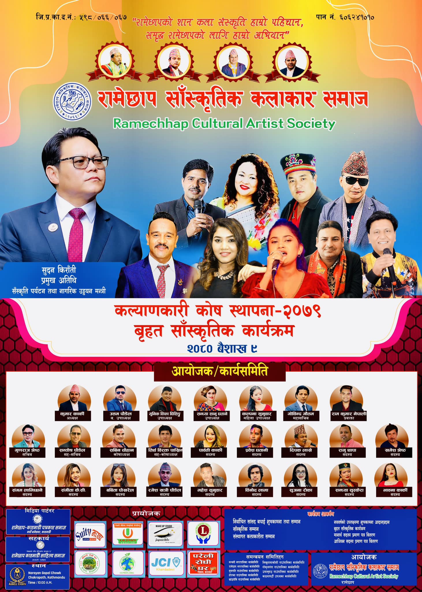कार्यक्रममा संस्कृति पर्यटन तथा नागरिक उड्यान मन्त्री सुदन किराँतीको पनि सहभागीता हुने भएको छ । कलाकार समाजका अध्यक्ष कुमार कार्कीले सांस्कृतिक कार्यक्रमसँगै कल्याणकारी कोष स्थापनाको लागि सहयोगको आग्रह गर्ने कार्यक्रम रहेको जानकारी दिए । कार्यक्रम भोलि बिहान अरिकल ईभेन्ट नारायणगोपल चोकान आयोजना गरिएको छ ।