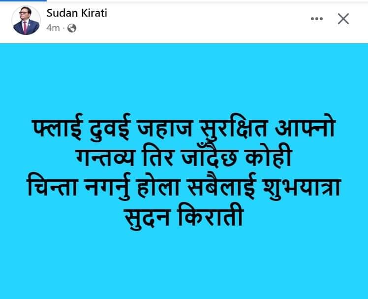 संस्कृति, पर्यटन तथा नागरिक उड्यानमन्त्री सुदन किरातीले त्रिभुवन विमानस्थलबाट उडेको फ्लाइ दुबईको जहाज सुरक्षित रुपमा गन्तव्यतर्फ गएको बताएका छन् ।