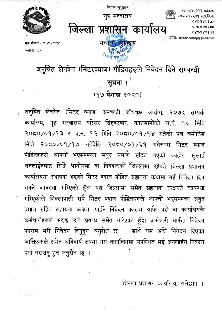 जिप्रका रामेछापले यही वैशाख ३१ गतेभित्र मिटर ब्याज पीडितहरुले आफ्नो भएसम्मका सवुद प्रमाणसहित ब्यहोरा खुलाएर अनलाइनबाट पनि सिधै आयोगमा वा निवेदकको जिल्लामा रहेको जिल्ला प्रशासन कार्यालय स्थापना भएको मिटर ब्याज पीडित सहायता कक्षमा निवेदन दिन सक्ने व्यवस्था रहेको जनाएको छ ।
