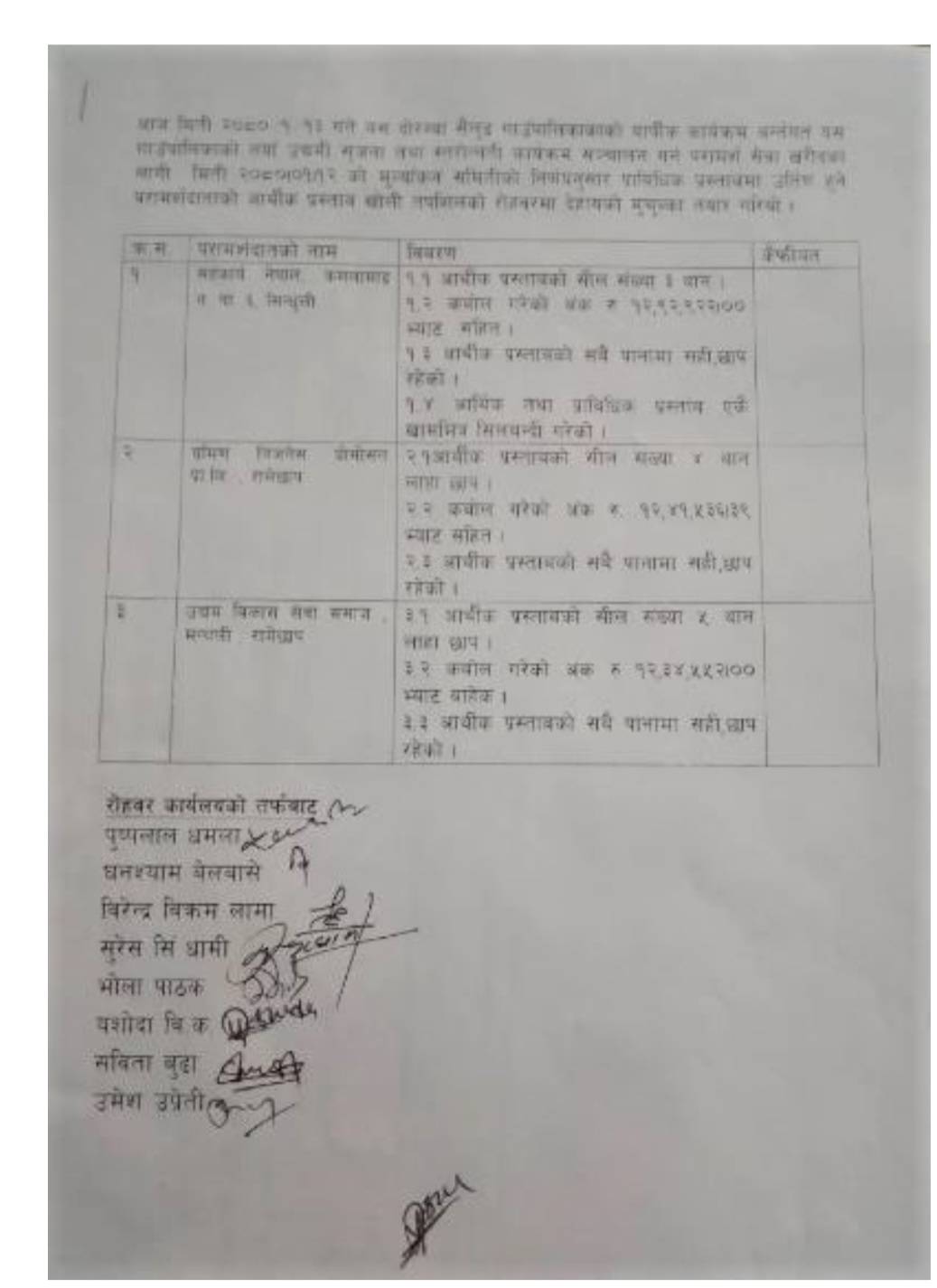 सार्वजनिक खरिद ऐन २०६३ को दफा २५ को उपदफा ७ अनुसार छनौट गरिएको भए भ्याट सहित सबै भन्दा कम आर्थिक प्रस्ताव पेश गर्ने संस्था ग्रामिण विजनेश प्रमोशन प्रा.लिले पाउनु पर्ने भएपनि सार्वजनिक खरिद ऐन धज्जी उडाउदै गाउँपालिकाका प्रमुख प्रशासकीय अधिृकत धमालासहितको कमर्चारीको मिलेमतोमा बढी आर्थिक प्रस्ताव पेश गर्नेलाई दिएको पाइएको छ ।