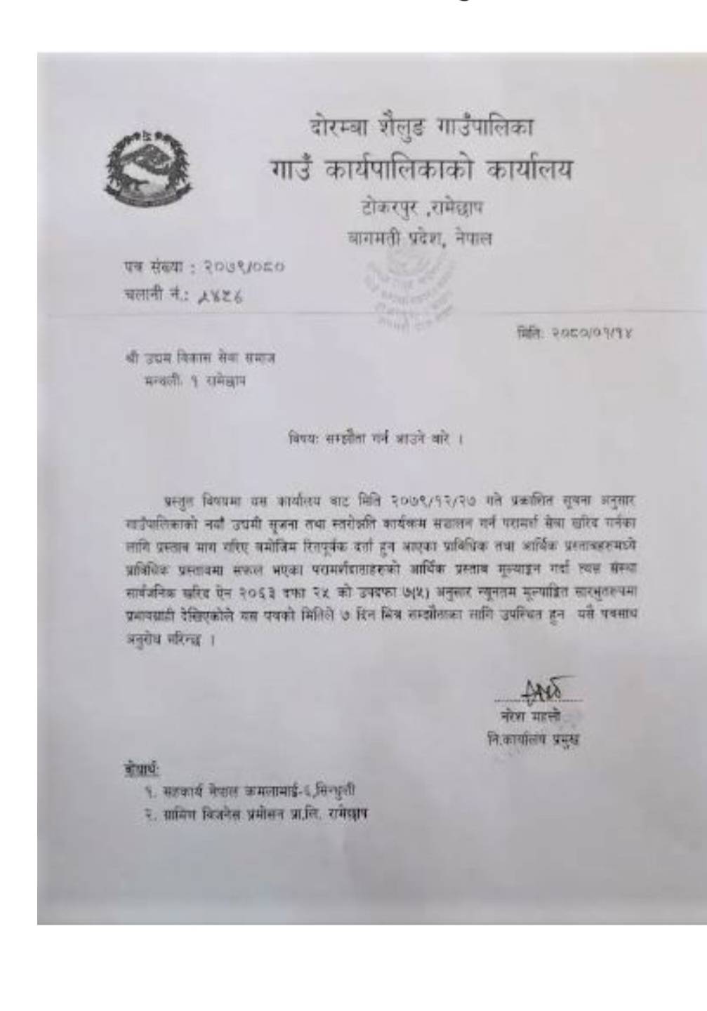 तर, गाउँपालिकाले मिति २०८० साल बैशाख १४ गते सूचना प्रकाशित गर्दै सार्वजनिक खरिद ऐन २०६३ को दफा २५ को उपदफा ७ (५) अनुसार न्यूनतम मुल्याङकन आर्थिक प्रस्ताव पेश गर्ने संस्थालाई छनौट गरिएको उल्लेख गरेको छ । सबै भन्दा बढी रकम प्रस्ताव गर्ने उद्यम विकास सेवा समाज रामेछापलाई ७ दिन भित्र सम्झौता गर्न पत्राचार गरेको थियो । सो पत्र बमोजिम गाउँपालिकाले बढी आर्थिक प्रस्ताव गर्ने उद्यम विकास सेवासँग नै सम्झौता गरेको छ ।
