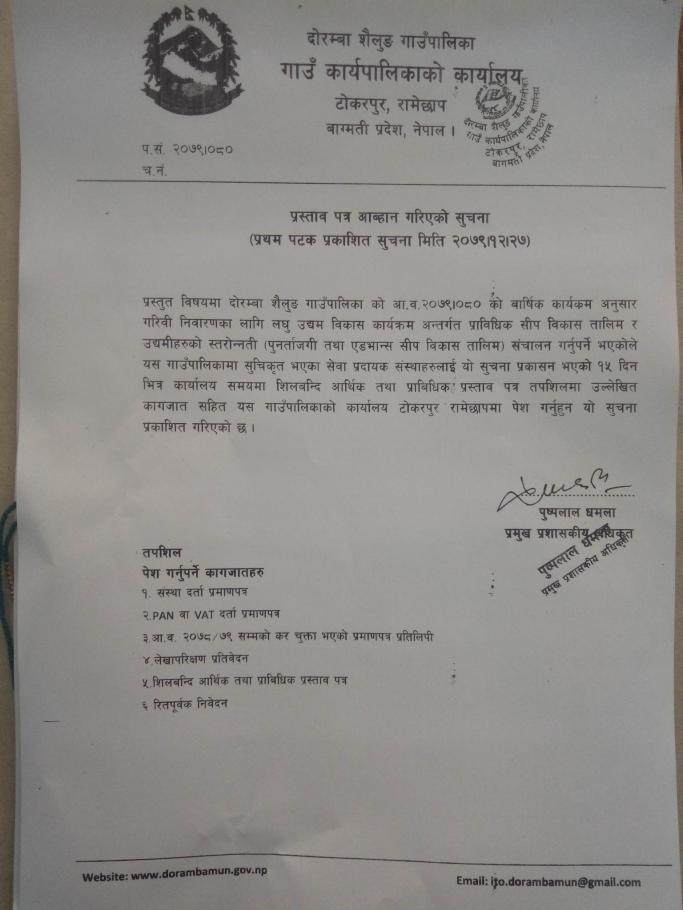 गाउँपालिकाले २०७९ साल चैत्र २७ गते सूचना प्रकाशित गरी गाउँपालिकामा सूचीकृत भएका संस्थालाई शिलबन्दी आर्थिक एवं प्राविधिक प्रस्ताव पेश गर्न भन्दै सूचना प्रकाशन गरेको थियो । सोही सूचना अनुसार सहकार्य नेपाल सिन्धुलीले भ्याट सहित १२ लाख ९२ हजार ९ सय २२ रुपैयाँ, ग्रामिण विजनेश प्रमोशन प्रा.लि. रामेछापले भ्याट सहित १२ लाख ४१ हजार ५ सय ३६ रुपैयाँ र उद्यम विकास सेवा समाज रामेछापले भ्याट बाहेक १२ लाख ३४ हजार ५ सय ५२ रुपैयाँ बराबरको आर्थिक प्रस्ताव गरेका थिए ।