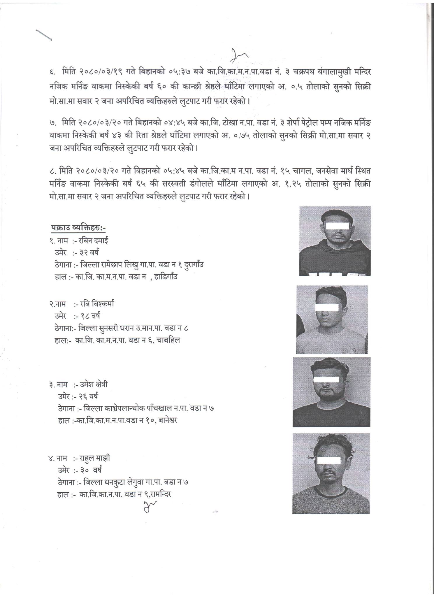 महानगरीय अपराध महाशाखाको टोलीले उमेश क्षेत्री, रविन दमाइ, रविन विक र राहुल माझीलाई पक्राउ गरेको बताएको छ । पक्राउ पर्नेहरुमा रामेछाप लिखु तामाकोसी गाउँपालिका– १ घर भएका रविन दमाई पनि पक्राउ गरेका छन् । प्रहरीका अनुसार उनी २०७२।०७३ सालदेखि लुटपाटको घटनामा पटक–पटक पक्राउ परेको रेकर्डमा छ। पहिलो घटना १ असारको बिहान कपुरधारामा भएको थियो । जहाँ मर्निङ वाक् हिंडिरहेकी रमा पाण्डेले घाँटीमा लगाएको गहना २ जनाले लुटपाट गरेका थिए । अँध्यारो नै भएको बेलामा सीसीटीभी फुटेज हेर्दा २ जना आएको देखिन्थ्यो ।