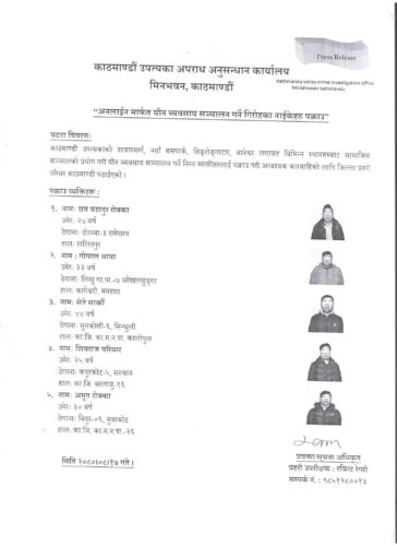 अनलाईन मार्फत यौन व्यवसाय सञ्चालन गर्ने रामेछापका रोक्कासहित पाँच जना पक्राउ