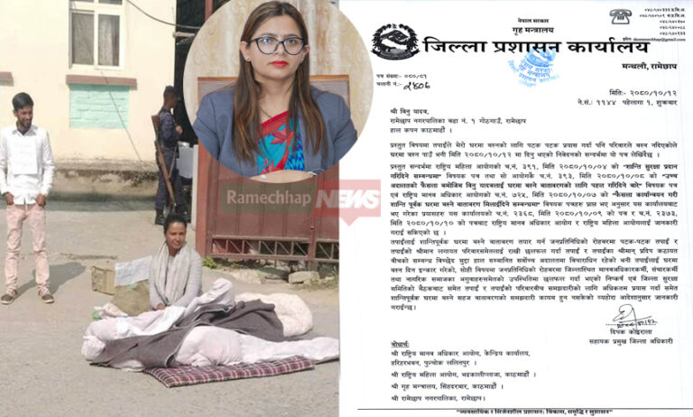 आफ्नो पतिको घरमा बस्न पाउनु पर्ने माग राख्दै ६ दिनदेखि अनशनरत विनु यादव (कठायत)ले आज अनशन तोडेकी छिन् । रामेछापका प्रमुख जिल्ला अधिकारी अनिता निरौलाको समन्वयमा यादवले आज साँझ अनशन तोडेकी हुन् । ६ दिनदेखि जिल्ला प्रशासनको गेटमा यादव अनसनमा बसेकी थिइन ।