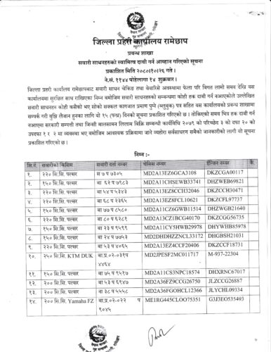 प्रहरीले यही यी सवारी साधनहरु कोही कसैको भए सोको सक्कल कागतजात प्रमाण पुग्ने (ब्लुबुक) पत्रसहित १५ दिनभित्र जिल्ला प्रहरी कार्यालयमा आउन सूचना प्रकाशित गरेको छ । तोकिएको समयभित्र हक दाबी गर्न नआएमा सरकारी सम्पत्ती तथा जिन्सी मालसामान लिलाम बिक्री सम्बन्धि कार्यविधि २०७९ को परिच्छेद ३ को दफा २० को उपदफा १ र २ मा व्यवस्था भए बामोजिम आवश्यक प्रक्रियामा जाने व्यहोरा सर्वधारण सबैको जानकारीका लागि यो सूचना प्रकाशित गरिएको छ ।