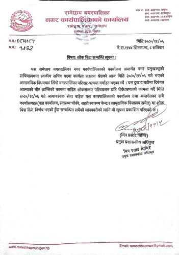 खाना सर्केर रामेछाप नगरपालिकाका प्रमुखका स्वकीय सचिव श्रेष्ठको मृत्यु, भोलि सार्वजनिक विदा