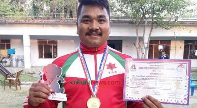 १० वैशाक, रामेछाप । आठौ राष्ट्रिय खेलकुद प्रतियोगीमा रामेछापमा खेलाडी टहल बहादुर बसेल ‘बिजय’ले स्वर्ण